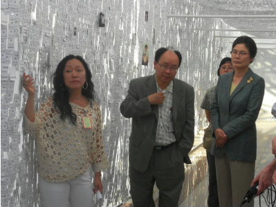 Explaining the installation to the lawmakers while Rev. Kim translates.