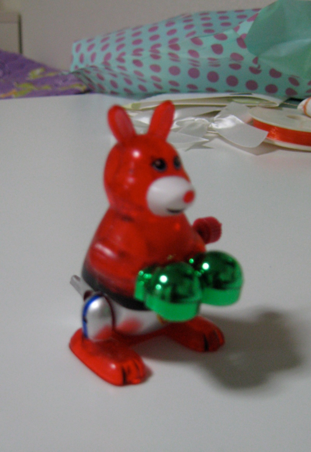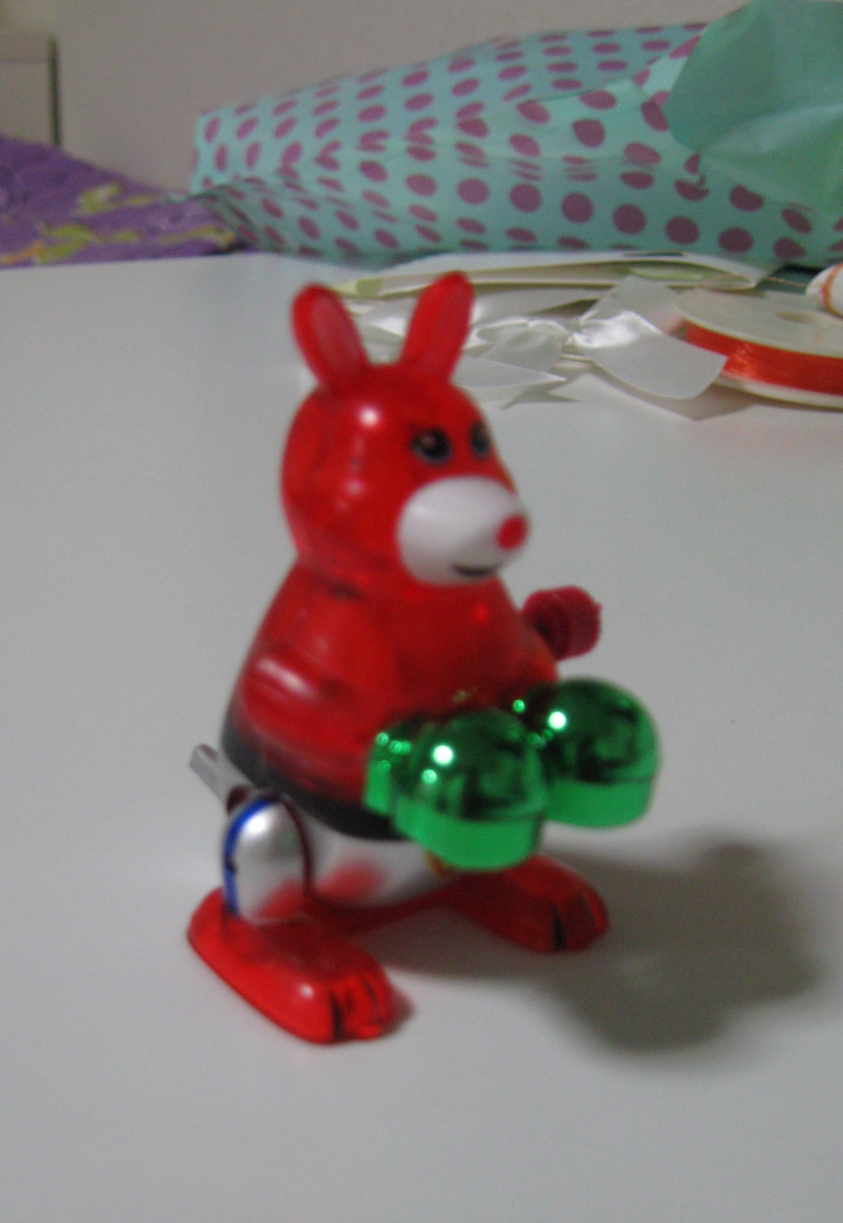I got this little wind-up toy for Jane as a wedding present, but he got crushed before I could give it to her and he exploded in pieces when I took him out of my bag.