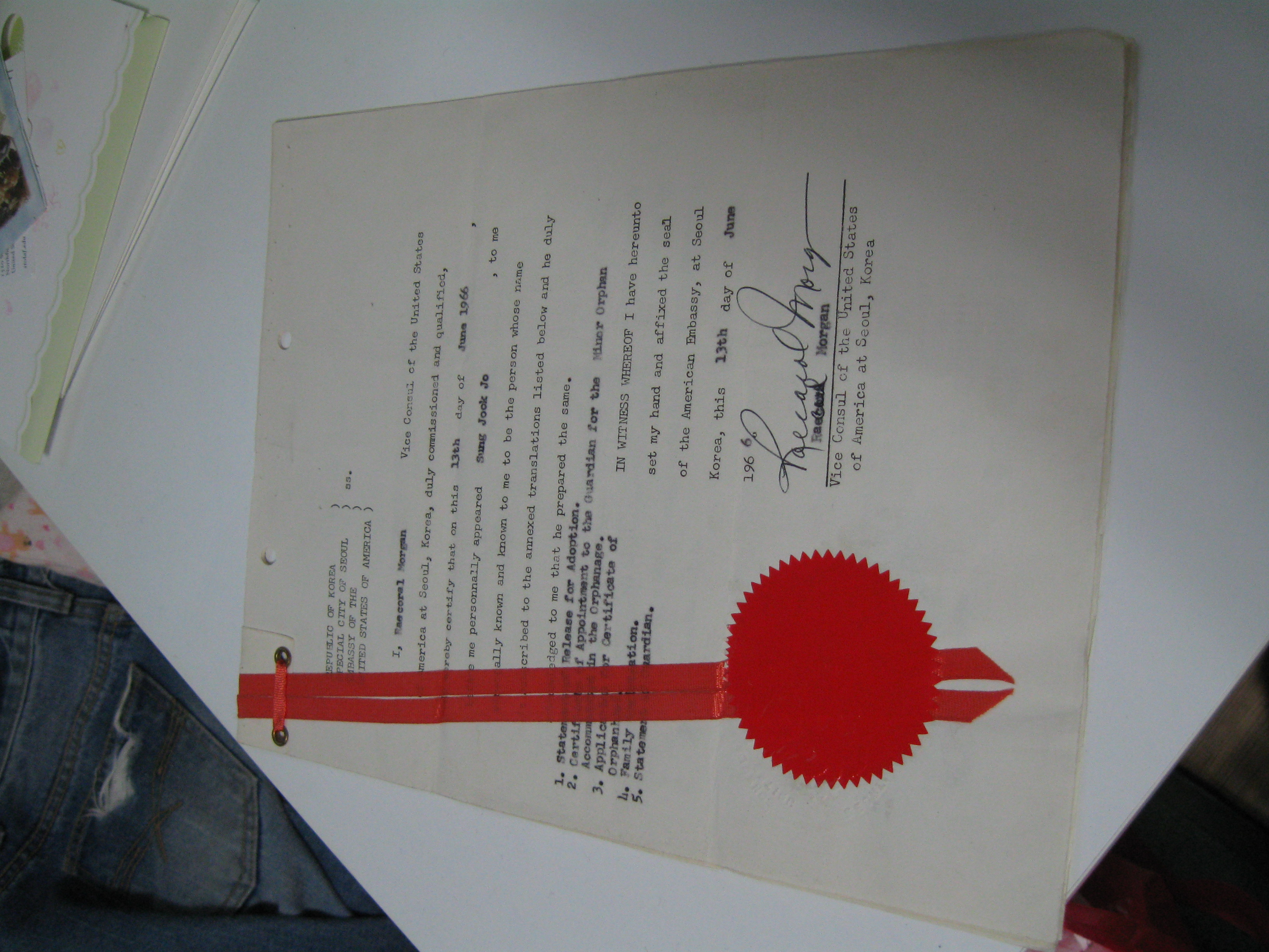 I gave her my one-way travel certificate out of Korea and will be sending her the rest of my “original” documents. I had found that these were already in my possesion, unknown to me, after I had sent away for my “child records” from Holt International.