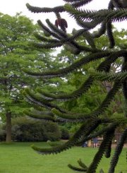 Speaking of trees, the trees that appear so fluffy when seen from a distance are the Ginko’s. They have these long branches that don’t split off into more branches, and the leaves are really tight to the branch, and the trees are fleshed out by a profusion of long skinny arms, vs. dividing into many sub branches, kind of like the monkey puzzle tree. Now one is a deciduous, and one is a coniferous, but it’s curious to my ignorant eye how both of these living fossils seem so similar to each other: one spiny / one fluffy…