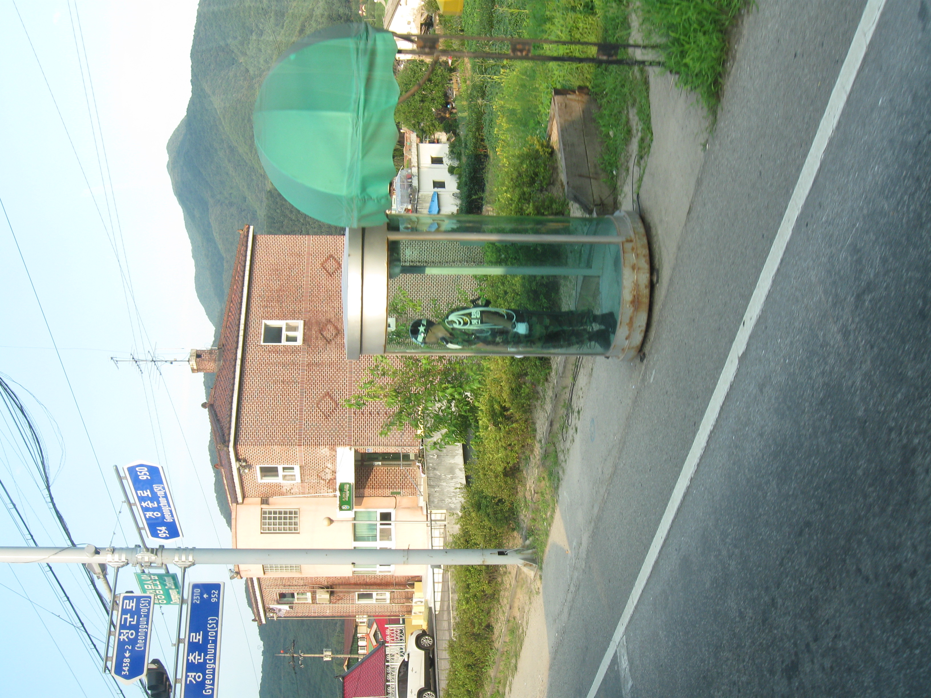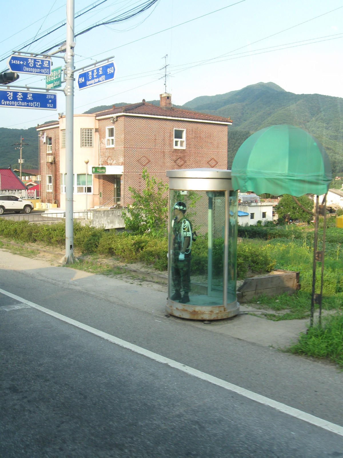 Here is the crappiest guard duty ever, standing by yourself in a glass box in the blazing sun all day. There is a small military presence here, but I don’t know what they do and where they are located or why this one lone sentinel exists.