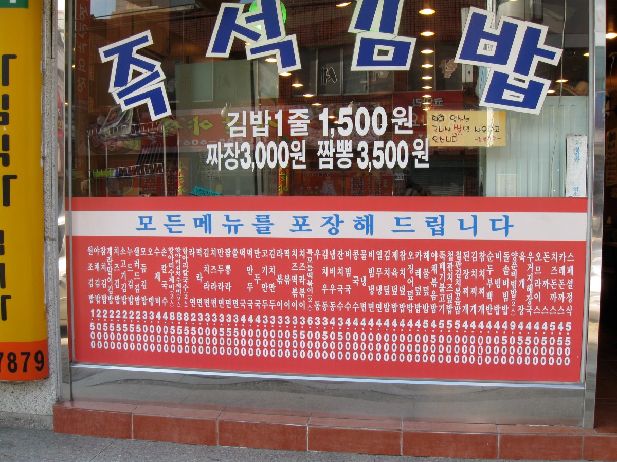 So this is fast-food, Korean style. The ubiquitous kimbap shops all over Korea, from which foreigners eat half their meals at because it’s one of the few places that you are certain to not get turned away because you’re eating alone. Plus it’s dirt cheap. But I took the photo of it just to show what hanguel overload can feel like when you’re illiterate and it takes you forever to sound out each word.