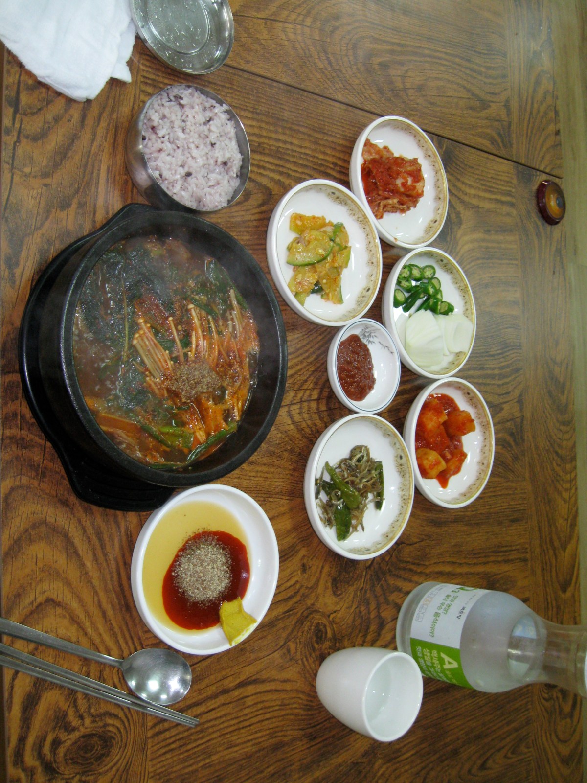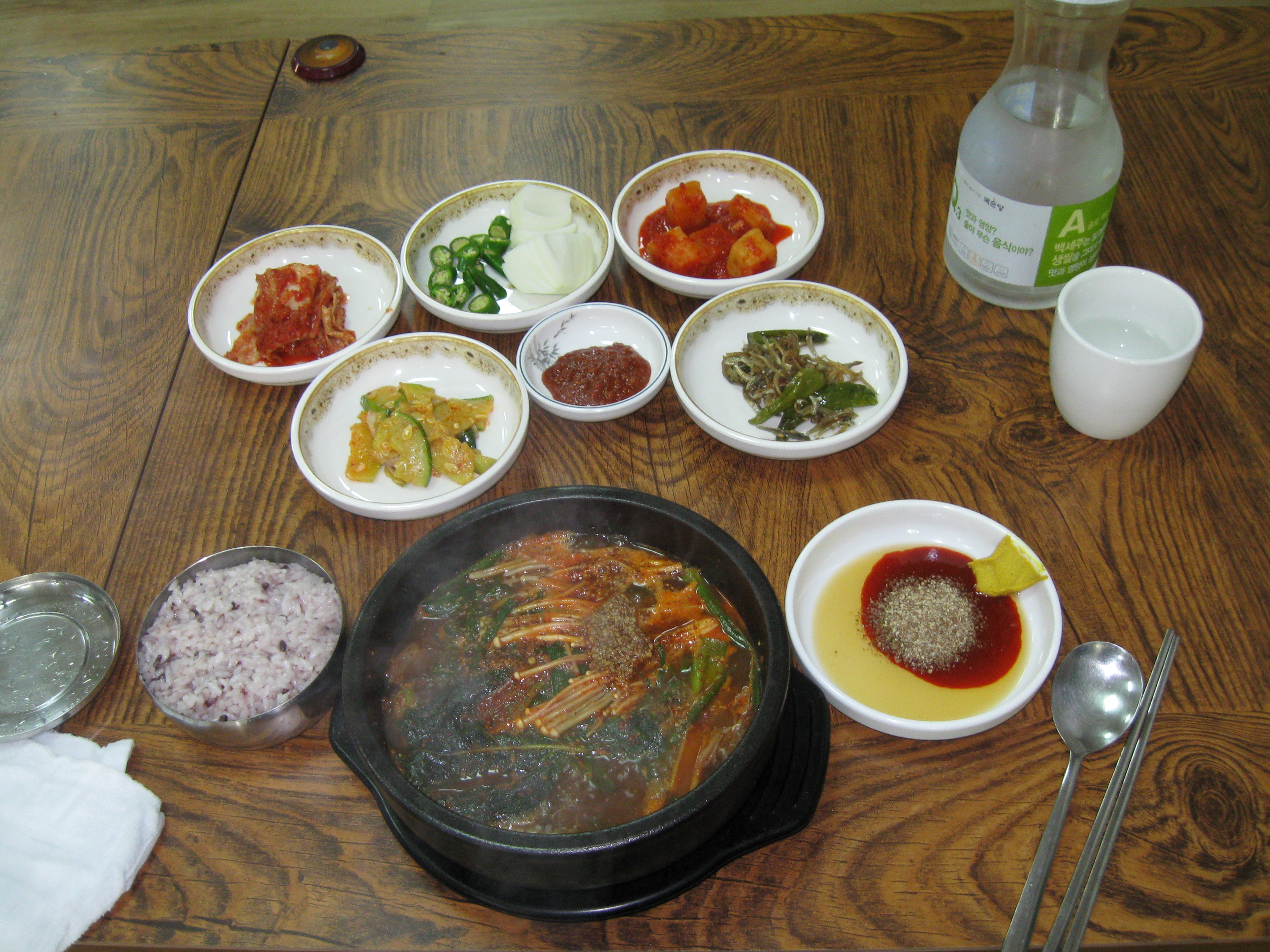 So this was my destination today, as I’ve been fascinated by the signage. Most Korean restaurants specialize in one or two types of food, and it’s quite shocking to foreigners to have their sensibilities assaulted with, for example, a huge picture of a pig facing them when going to eat at a pork restaurant. Koreans haven’t sanitized where their sources of food come from at all, which is a good thing. But the specialization is kind of a bummer if you have a party of people who have specific tastes and could use a variety of foods on the menu. But that’s not the group way here. So fill up on banchan and pray there’s no animal products in the soup broth if you’re a vegetarian.