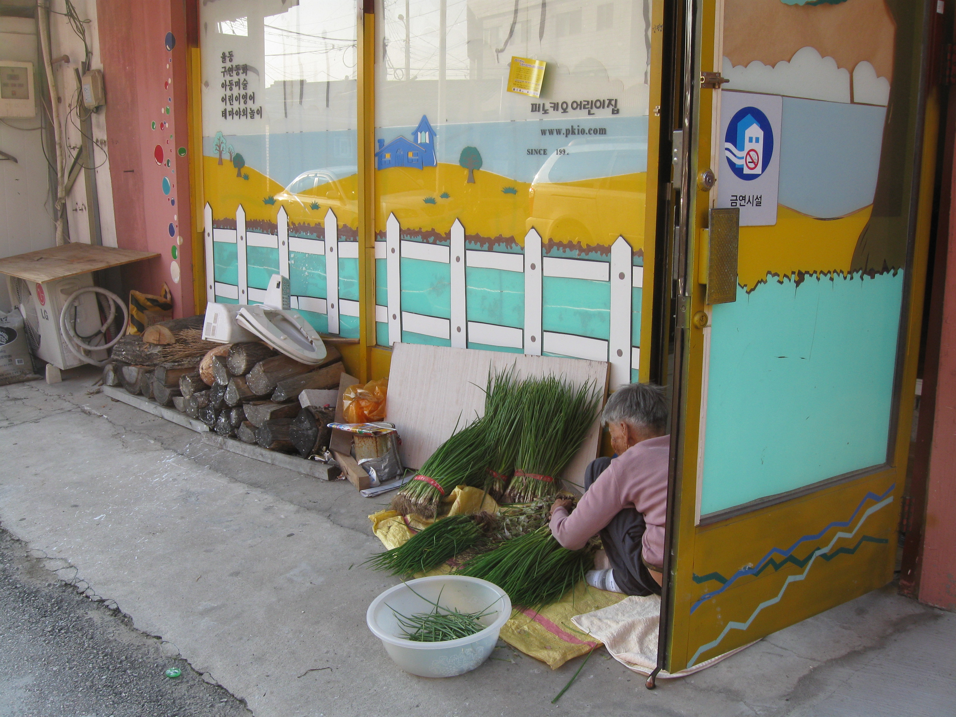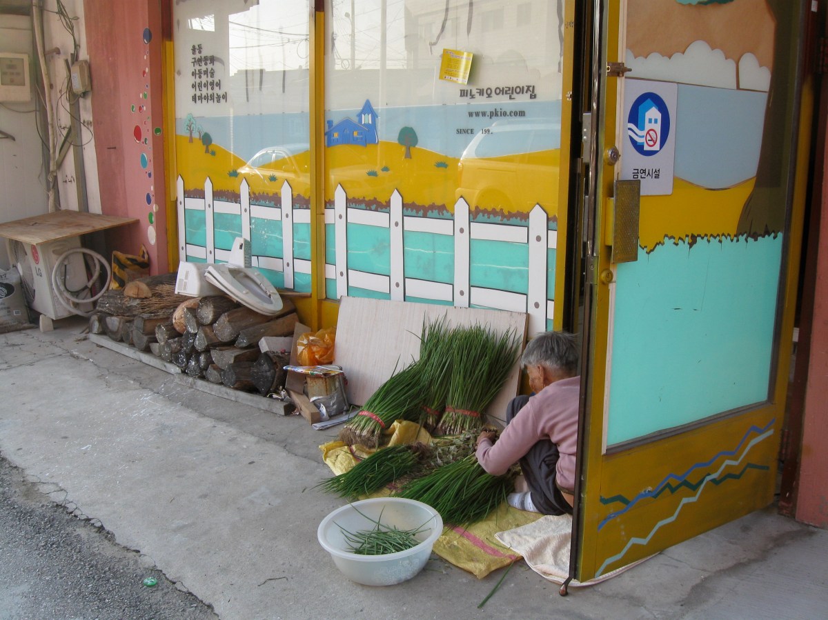 Next door a halmoni is doing food prep in a doorway. Whenever business is slow, restaurant workers/owners can be seen cleaning, sorting, and preparing huge quantities of vegetables for banchan. It’s usually a nice social activity – one that reminds me of the southern ladys I grew up with in my neighborhood, who would all snap beans together and gossip. But this poor halmoni is doing it all by herself.