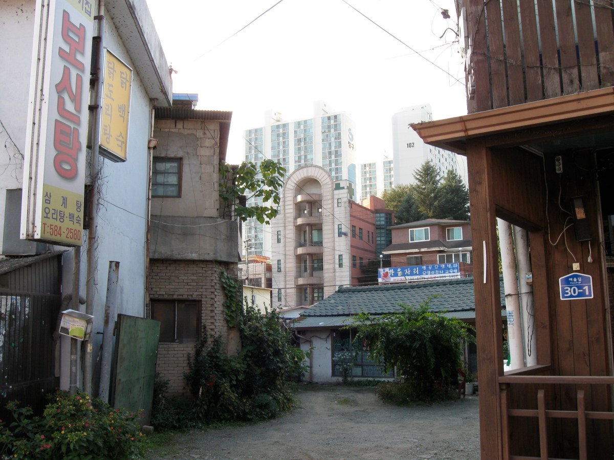 And while they are all complaining about having to do these “fun” activities, (another example of the idea of collective not being wonderful to all involved) I go home. Only today I watched two movies while drinking makkolli and then, after opening my tin bank of 100 won coins with a can opener, hauling the 15 lbs of change down to the bank and netting 76,000 won, (people often comment on how I don’t take the time to unload my change when purchasing things, but saving change is just something I’ve always done as a welfare mom – it really comes in handy when, like this month, I accidentally sent too much to my American bank account) I decided to take a stroll in my neighborhood and find some dinner out.