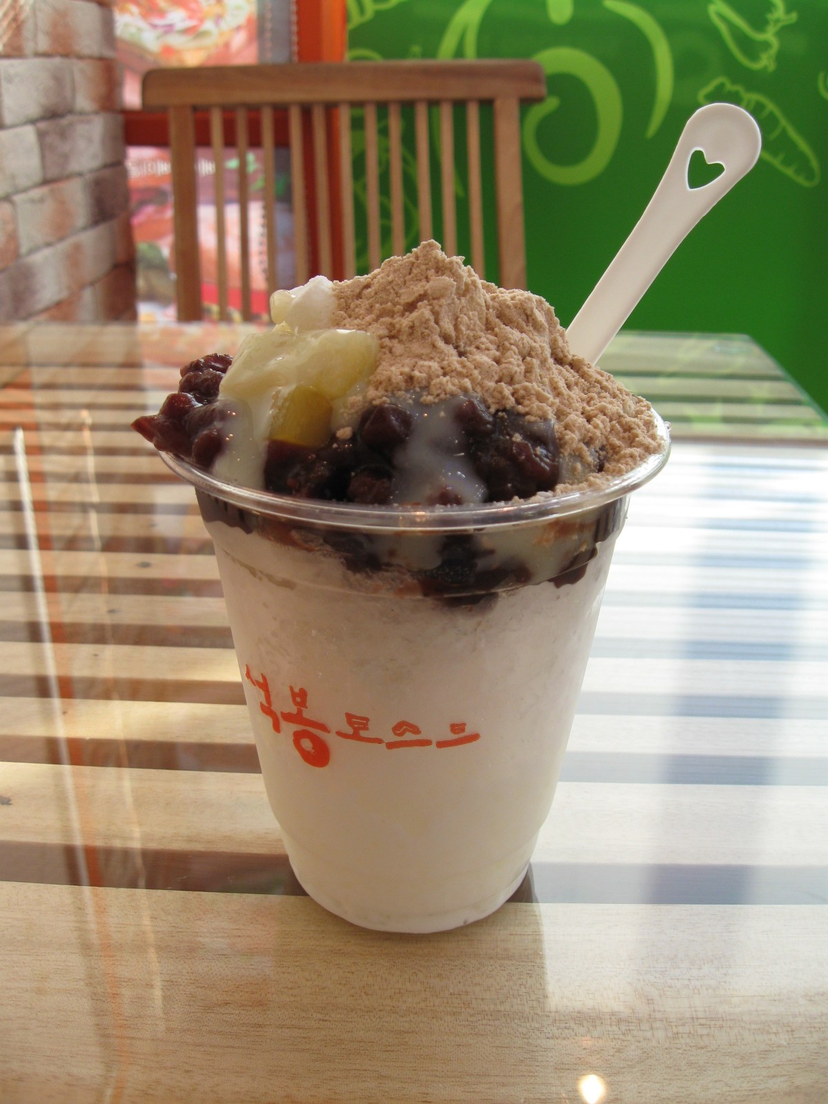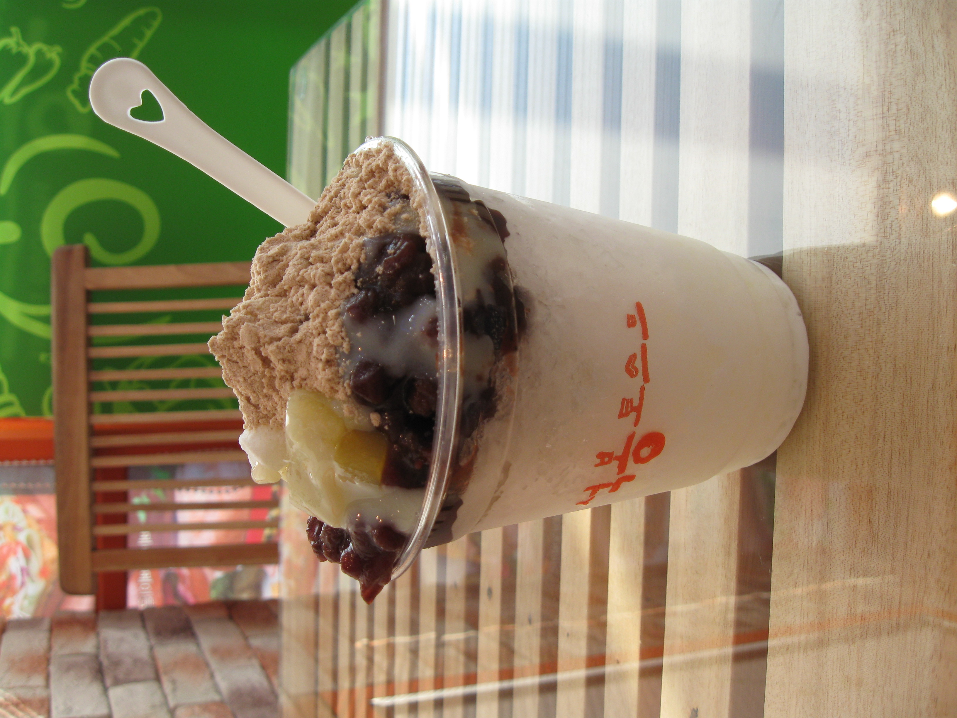 After dinner I stopped at the little coffee/donut/toast shop and ordered cup binsu for dessert. Last year ice cream helped me survive the Korean summer. This year, it was pat bingsu. Which is, for those of you who don’t know, milk, sugar, shaved ice, sweet red beans, fruit, tiny rice cakes (which taste like marshmallows but a little chewier) and topped off with cereal powder. And that cereal powder is really yummy. Like everything Korean, you’re supposed to mix it up until it’s an ugly, unappetizing-looking mess and then eat it. Which I HATE doing and I always get comments from Koreans for not doing so. But unlike the rest of the Korean food, I actually do mix this up. Only I wish the cereal came on the side, as it’s nice as a topping and not mixed in. This set me back 1,500 won, or about a buck and a quarter. Usually it’s sold by the bowl and at least two people should share one. In Seoul you can get fancy fresh fruit ones with various combinations, such as with vanilla yogurt or green tea, etc. But it could set you back about 7 bucks since fruit is one of the most expensive items in groceries.