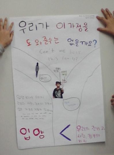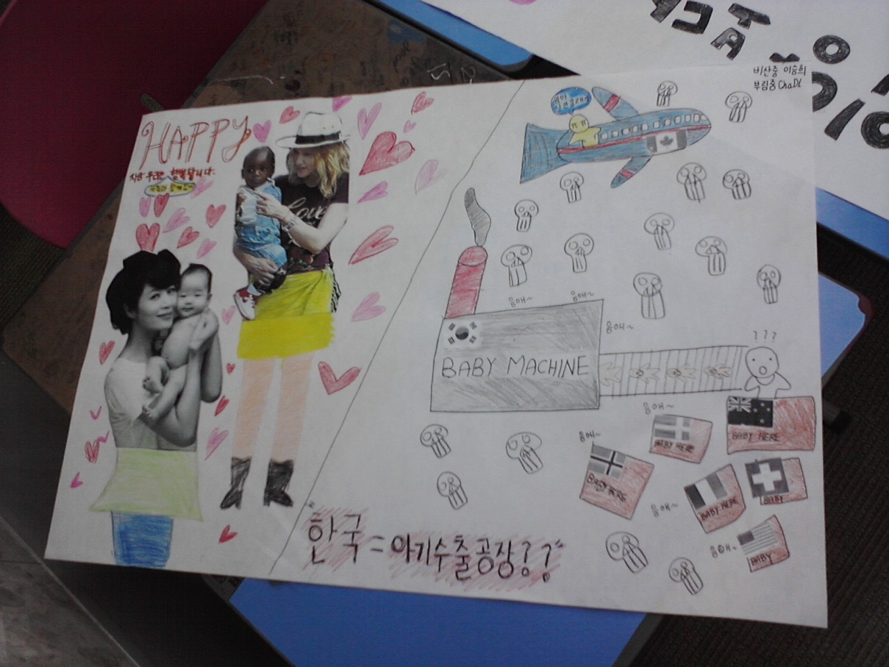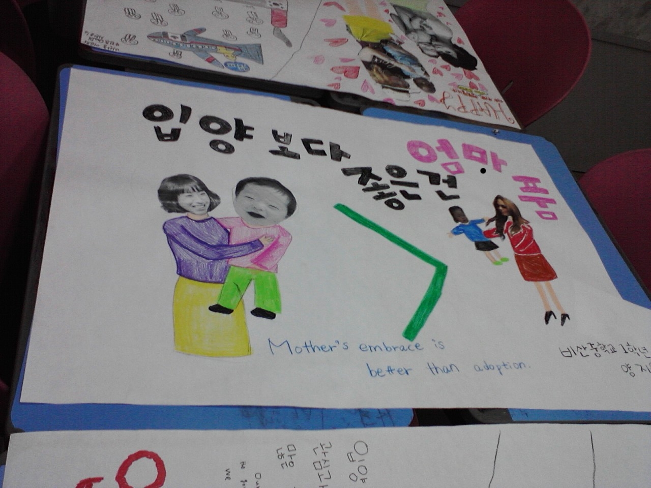 The following day we went to the hogwan and sat back as the students created posters of entirely their own direction after only being given images of adoption. It’s so great what kids can come up with on their own!