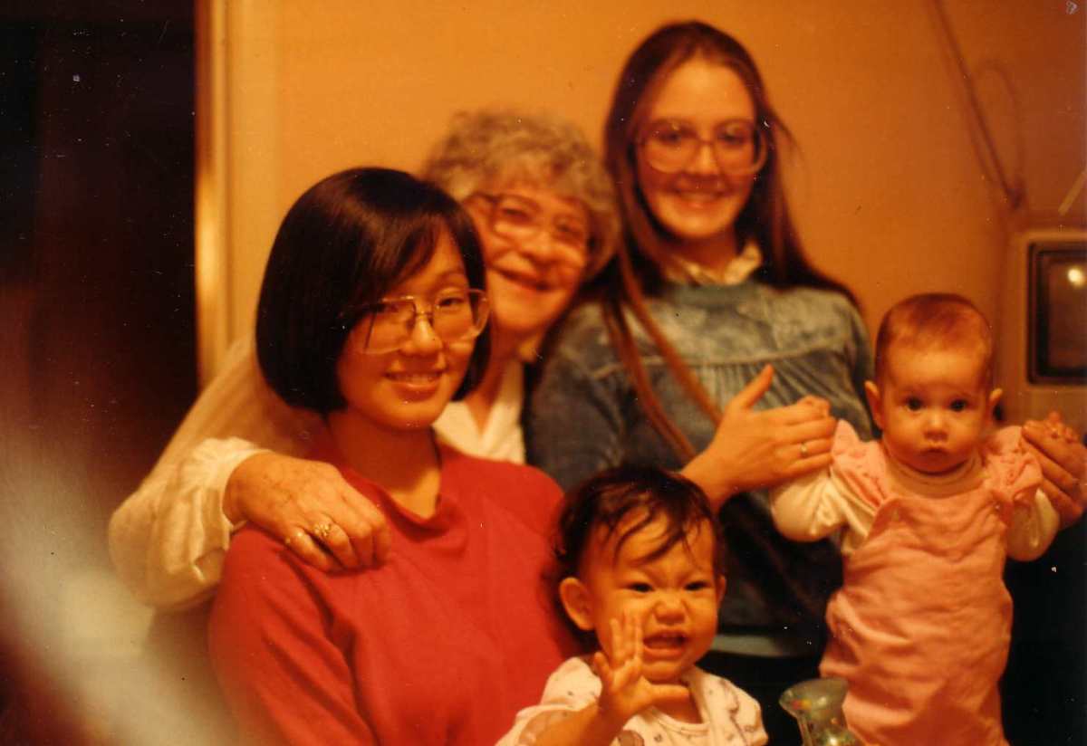 This is me, thirty pounds overweight and pregnant with my son. (Yes, the glasses are huge – it was the eighties!) And behind me is my mom. See? She had her moments. She really liked babies, and here she is on a rare (only?) occasion with two grandchildren.