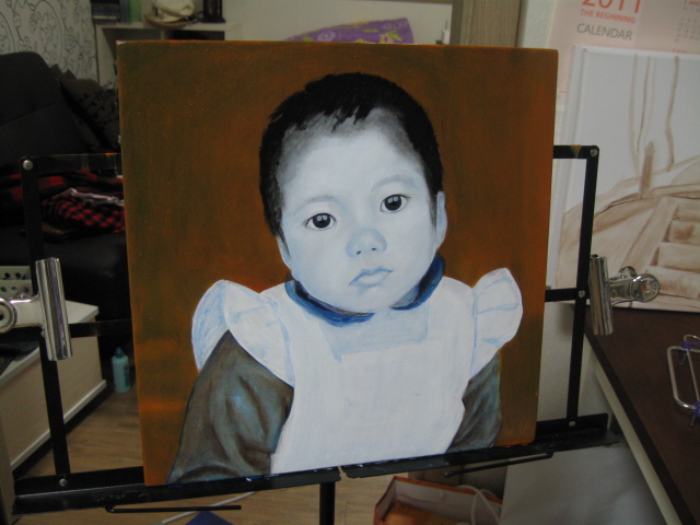 It’s taking me way too long. I think it’s because I chose to try to learn to glaze. And glazes aren’t as forgiving, I’ve found, so my mistakes are showing through. I also don’t like how the brush strokes stay in the glazes – I mean, strokes are nice in regular adding on of paint, but I don’t want them in my glazes. Also, I’ve messed up the colors – I’d totally take a different approach to colorizing a black and white photo. In addition, I’m making the basic shapes change too much. I also didn’t draw this prior to painting it, ’cause I hate the redundancy and hate transferring a drawing even more, but maybe I should have…I also did a horrible rookie mistake and used black out of the tube for her hair, so she has shoe-polish colored hair. Nor do I know how to paint hair and especially not baby peach fuzz. Live and learn. I just need so much more practice. Hours and hours and hours of practice. And I need to just play around with techniques. I guess I should do something abstract but without any structure at all – just really try for different effects. (sigh) I really need classes…