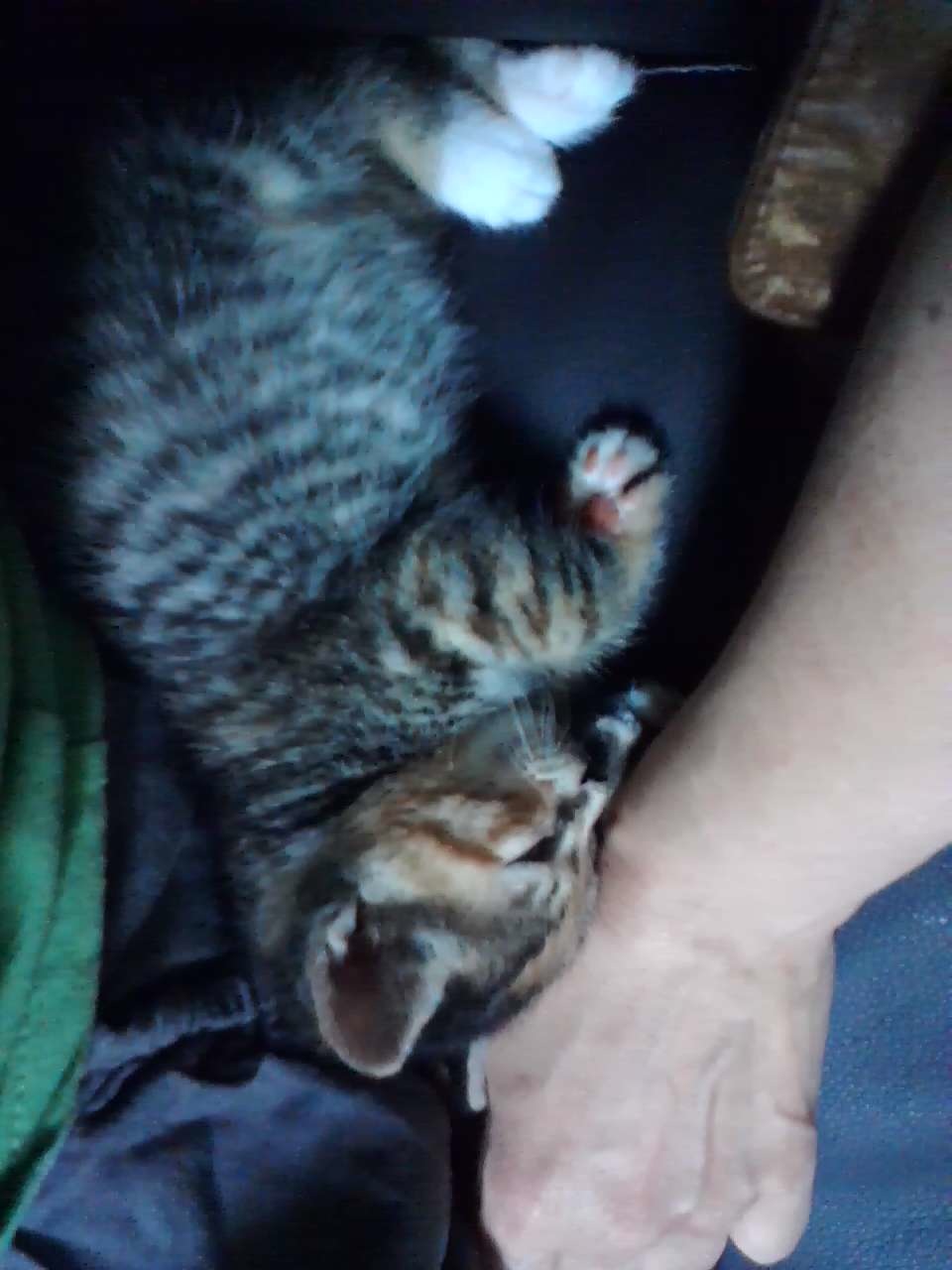 took kitten in to check for urinary tract infection and first vaccination – clean bill of health. however, we have achieved dry bed and sleeping buddy. i think it’s a combination of letting her gnaw on me for awhile, but not for long. spraying the bedding thoroughly with that enzyme/febreeze-like stuff and every time she stepped foot on it to throw her in the cat box. despite the vet’s advice to wait until July before giving treats, I break off and give her a tiny bit of treat after each time I see her use the box. close off my bedroom except when I’m in there. anyway, it’s getting better – just have a lot of reinforcing to do on all fronts. it’s seriously taking all my free time, watching her like a hawk, keeping her preoccupied, and attending her needs. it’ll be nice once she grows out of this kitten phase. but i think she is going to be a very loving lap cat once she does.