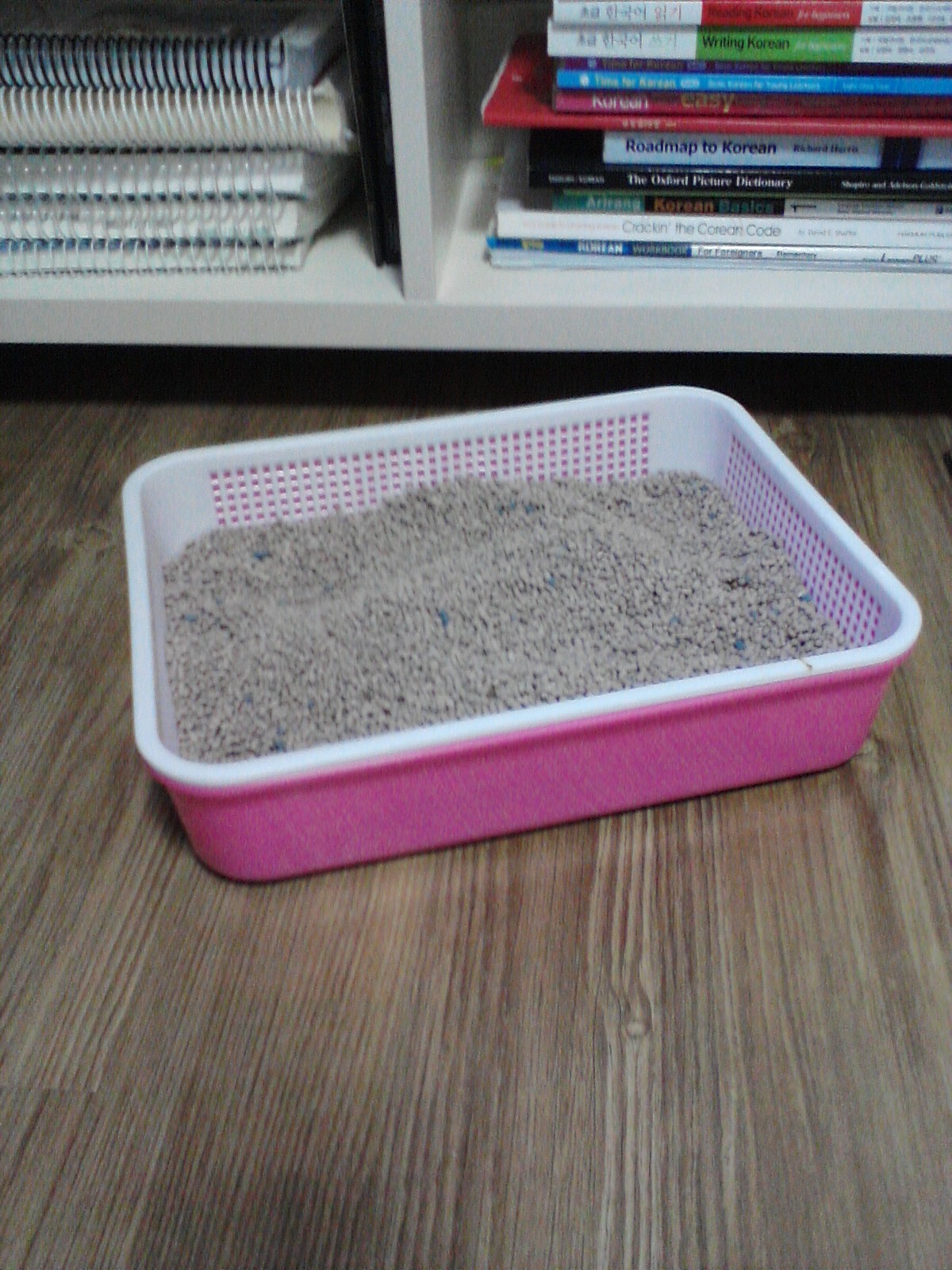 Went and got another litter box, which she immediately used and now prefers to the other one. It’s another vegetable colander, only deeper, so everything is contained really well. Plus, I left the strainer part in, so the liquids can drain through. Brilliant!