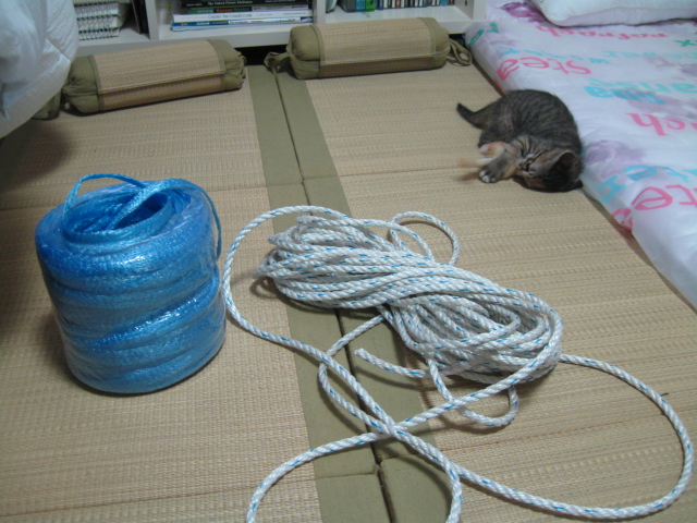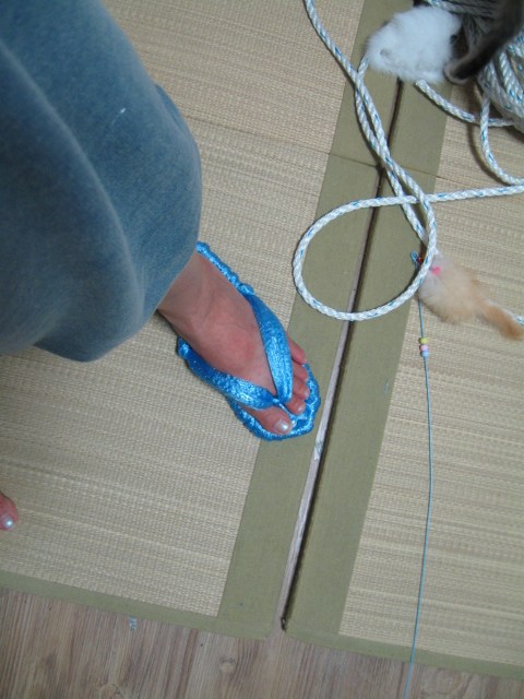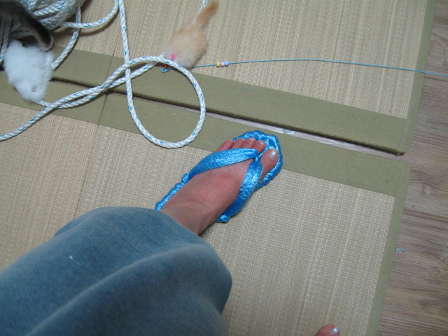 Right now, I need zorries to wear outside: something more robust than fabric. I went to the hardware store and found some rope, but all they had was the plastic kind. I asked if they had any natural (some Koreans know what that word is) ropuh and they didn’t understand, so I had to ask for ahn PVC. (they call all plastic PVC, except plastic bags, which they call vinyl – I have no idea what they call vinyl!) and the answer was anniyo. In a land of rice fields, in a place full of rice paddies, there’s no straw rope! Well, OK, straw would rot soon enough in these monsoons anyways. Hopefully I can take a jipshin-making class in the fall, after rice harvest.