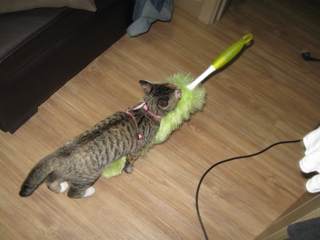 That picture with the feather duster is so cute!!! Did the kitty tranqs work at all?